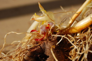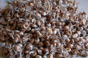 Nous arrachons les précieux bulbes en mai après qu'ils aient profités au maximum de leur croissance en pleine terre et les laissons sécher quelques temps à l'abri des rongeurs et de l'humidité.